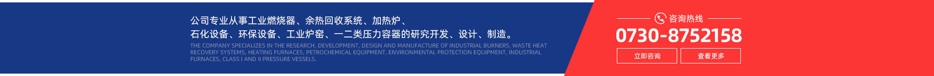 公司專(zhuān)業(yè)從事工業(yè)燃燒器及其智能化控制系統(tǒng)、余熱回收系統(tǒng)、加熱爐及各類(lèi)爐配件、石化設(shè)備及配件、環(huán)保設(shè)備、工業(yè)爐窯及其輔助設(shè)備配件、一二類(lèi)壓力容器的研究開(kāi)發(fā)、設(shè)計(jì)、制造。